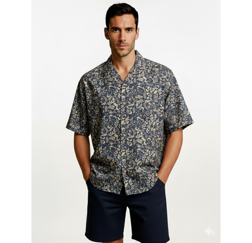 Una propuesta con carácter que combina fondo oscuro y estampado vegetal en contraste. Esta camisa aporta un estilo moderno y desenfadado, perfecta para looks de verano con un punto sofisticado.