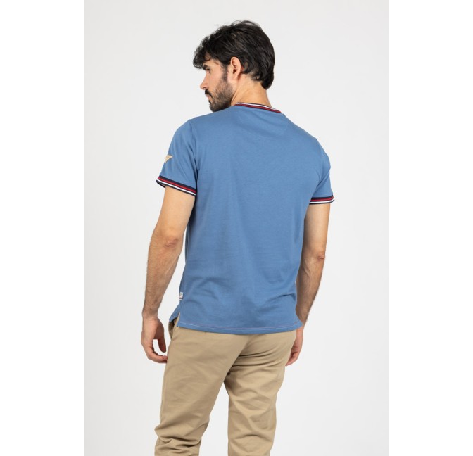 Cuello redondo con ribete en contraste en tonos rojo, blanco y azul marino, que refuerza su carácter casual. Tejido suave y ligero que garantiza confort durante todo el día.