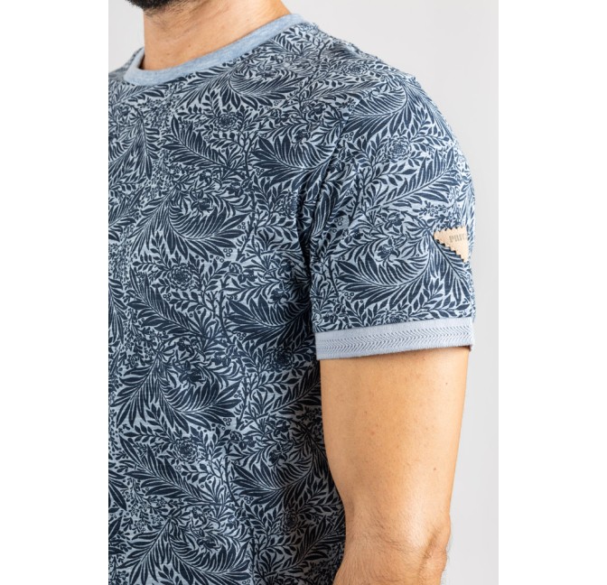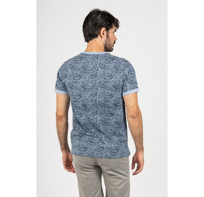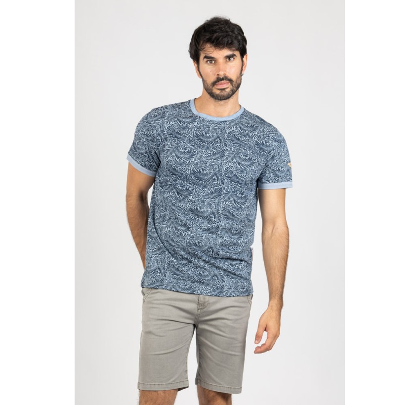 Camiseta de tejido microlistado en tono azul con estampado floral de inspiración tropical, ideal para un look fresco y diferenciador.