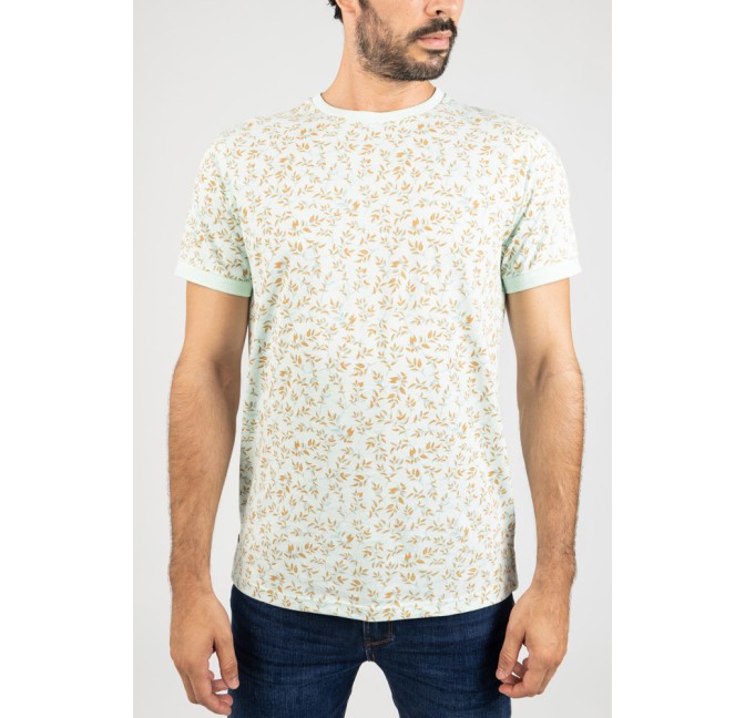 Camiseta en tono verde agua con estampado de pequeñas hojas en contraste, perfecta para un look veraniego y desenfadado.