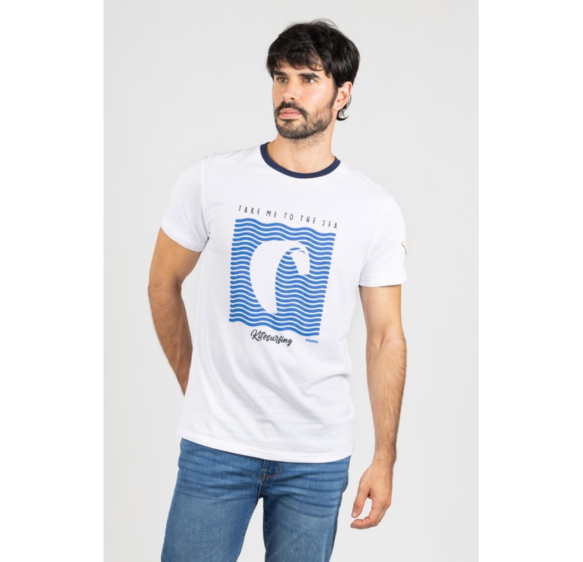 Camiseta en tono blanco con estampación frontal “Take me to the sea”, inspirada en el mundo del kitesurf y el estilo marítimo.