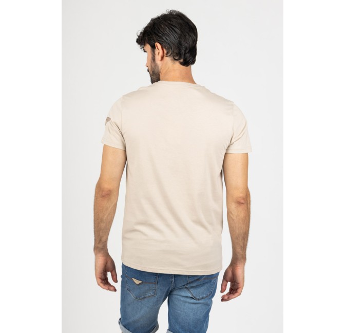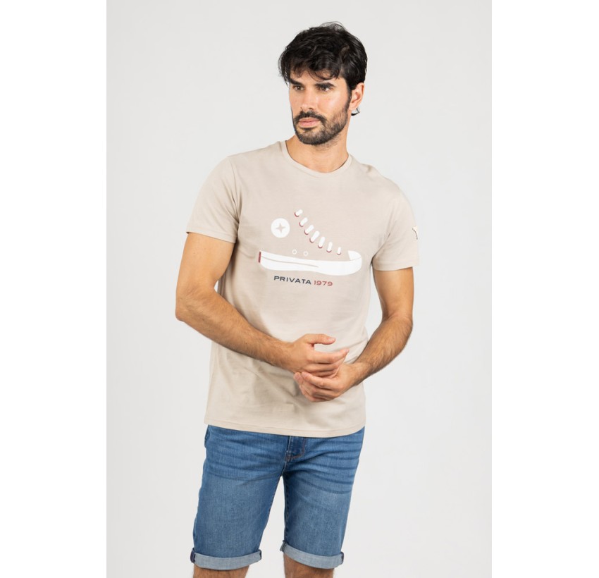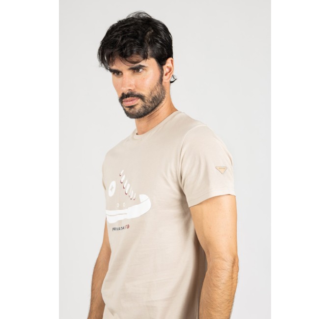 Camiseta en tono beige con estampación frontal de inspiración urbana, ideal para un look casual y moderno.