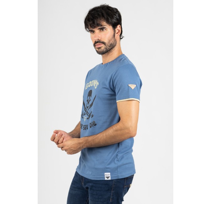 Camiseta en tono azul con estampación frontal de inspiración pirata, un diseño con aire retro que aporta carácter y personalidad.