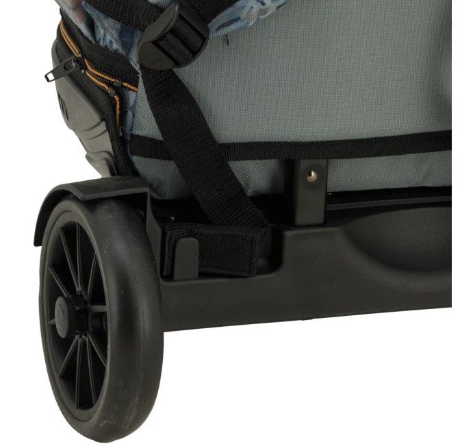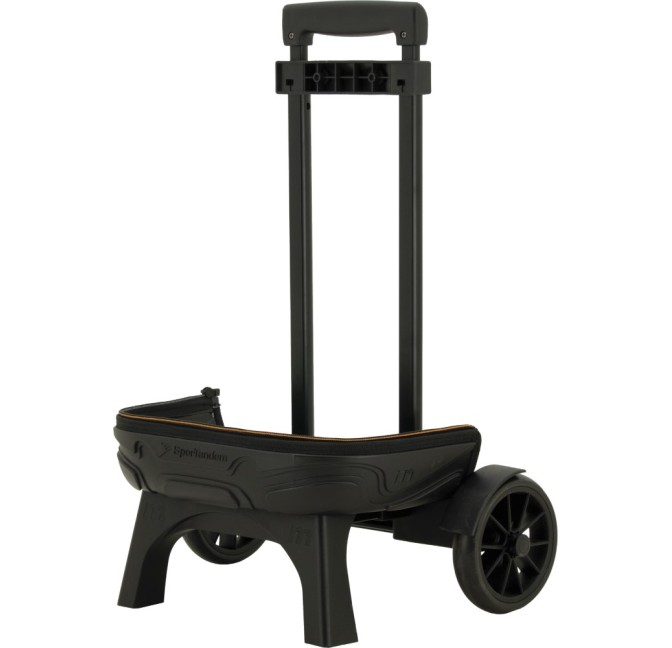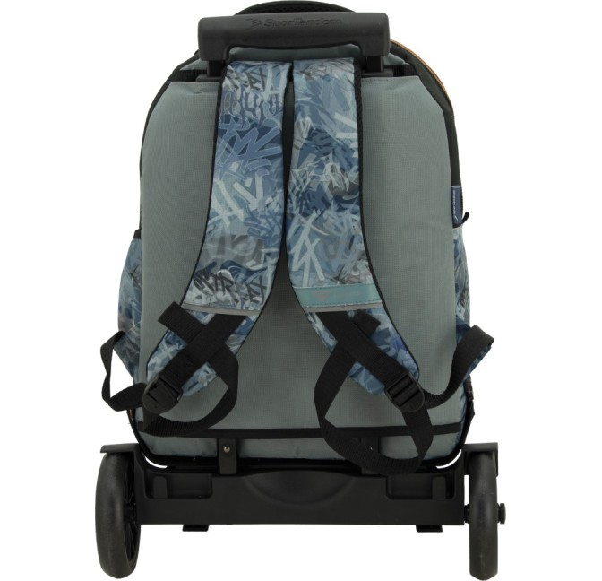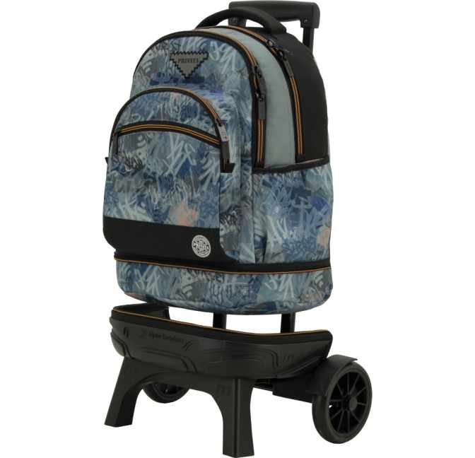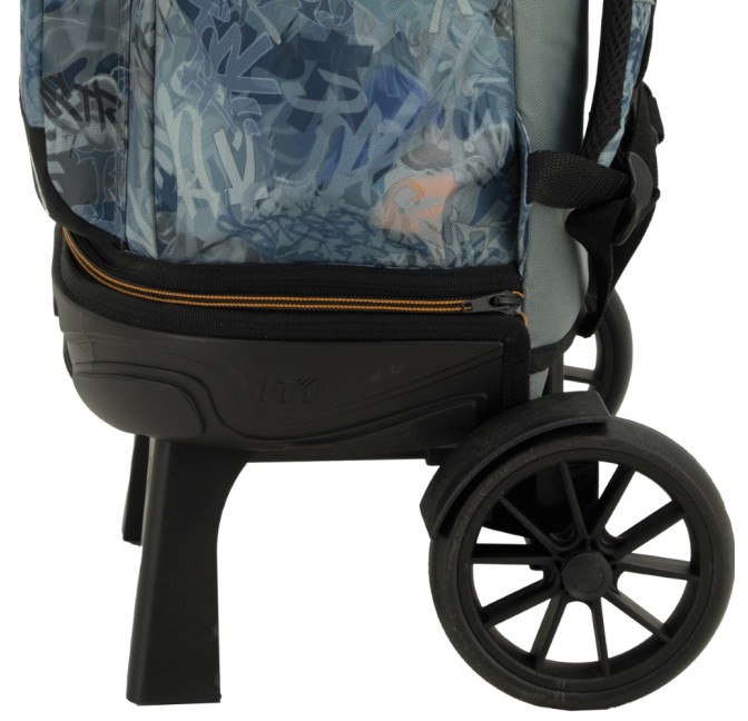 2 usos en 1: el uso de Carro fijo de base resistente. Con dos ruedas grandes y silenciosas para lograr un mejor movimiento y estabilidad. La posición e inclinación de sus dos patas delanteras evitan el volcamiento del carro y el otro uso de solo mochila, pues  se puede separar del carro a través de la cremallera que los une. Tiene dos compartimientos amplios y un bolsillo frontal con un organizador interno.  Tirantes ergonómicos de espuma transpirable con velcro al final que se adhieren al espaldar para que no se arrastren por el suelo. Bolsillo en el lateral derecha para llevar una botella . Asa acolchada de agarre superior.