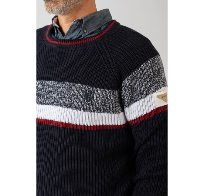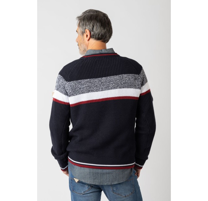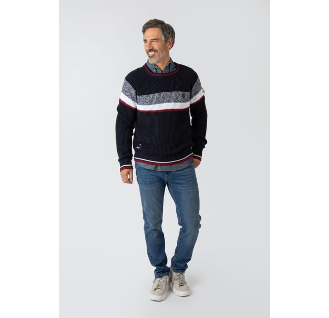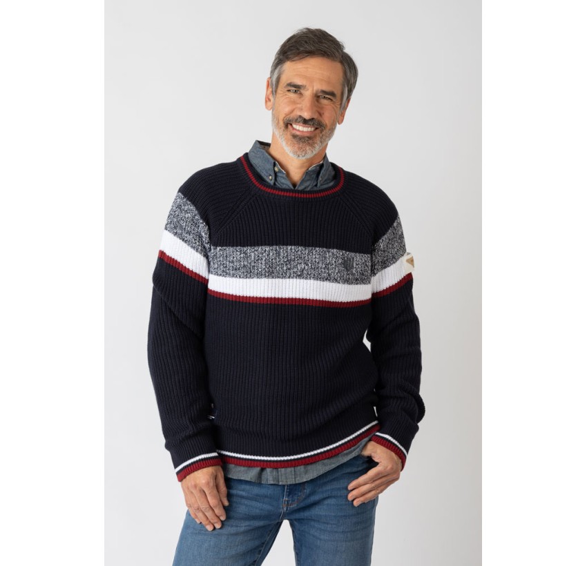 Siente el espíritu Privata con jersey cuello redondo, tejido confortable y agradable. Diseño combinando los colores marino, blanco y granate.