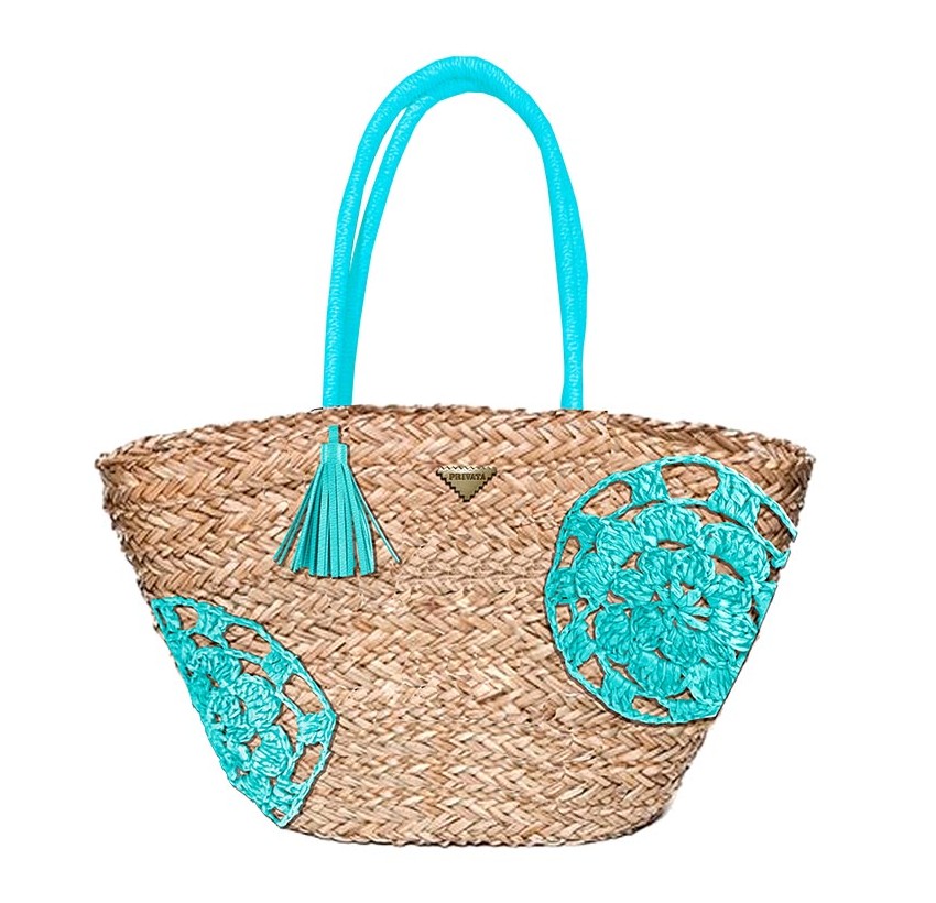 Cesta de playa en fibras vegetales con detalle de crochet en turquesa.