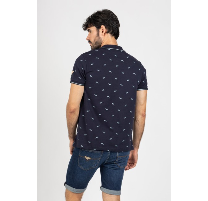 Polo en tono azul marino con micro estampado de gafas de sol, una propuesta elegante con un toque desenfadado.
