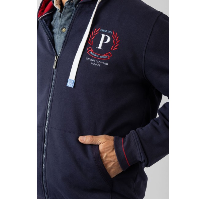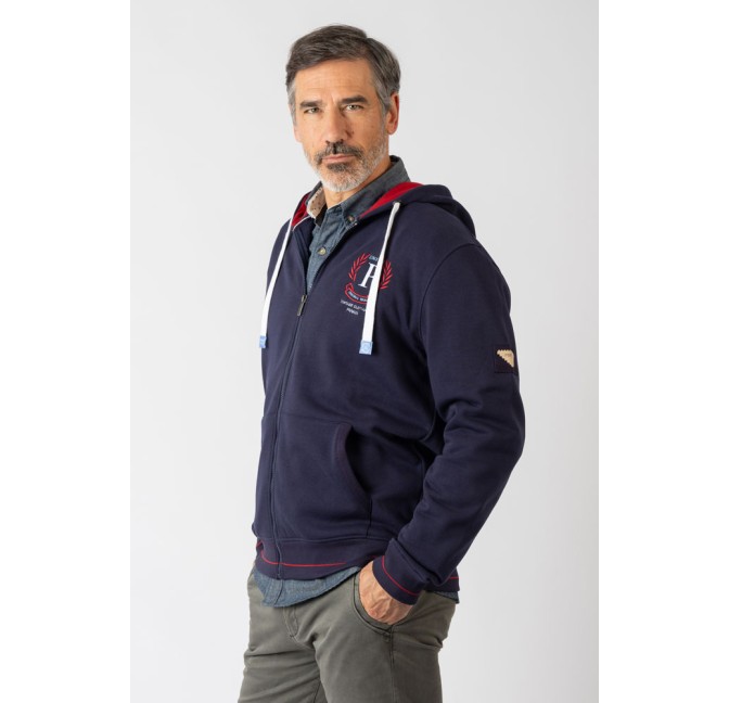 Sudadera abierta con capucha y bolsillos con tejido  suave, combinación gráfica bordada en el pecho.